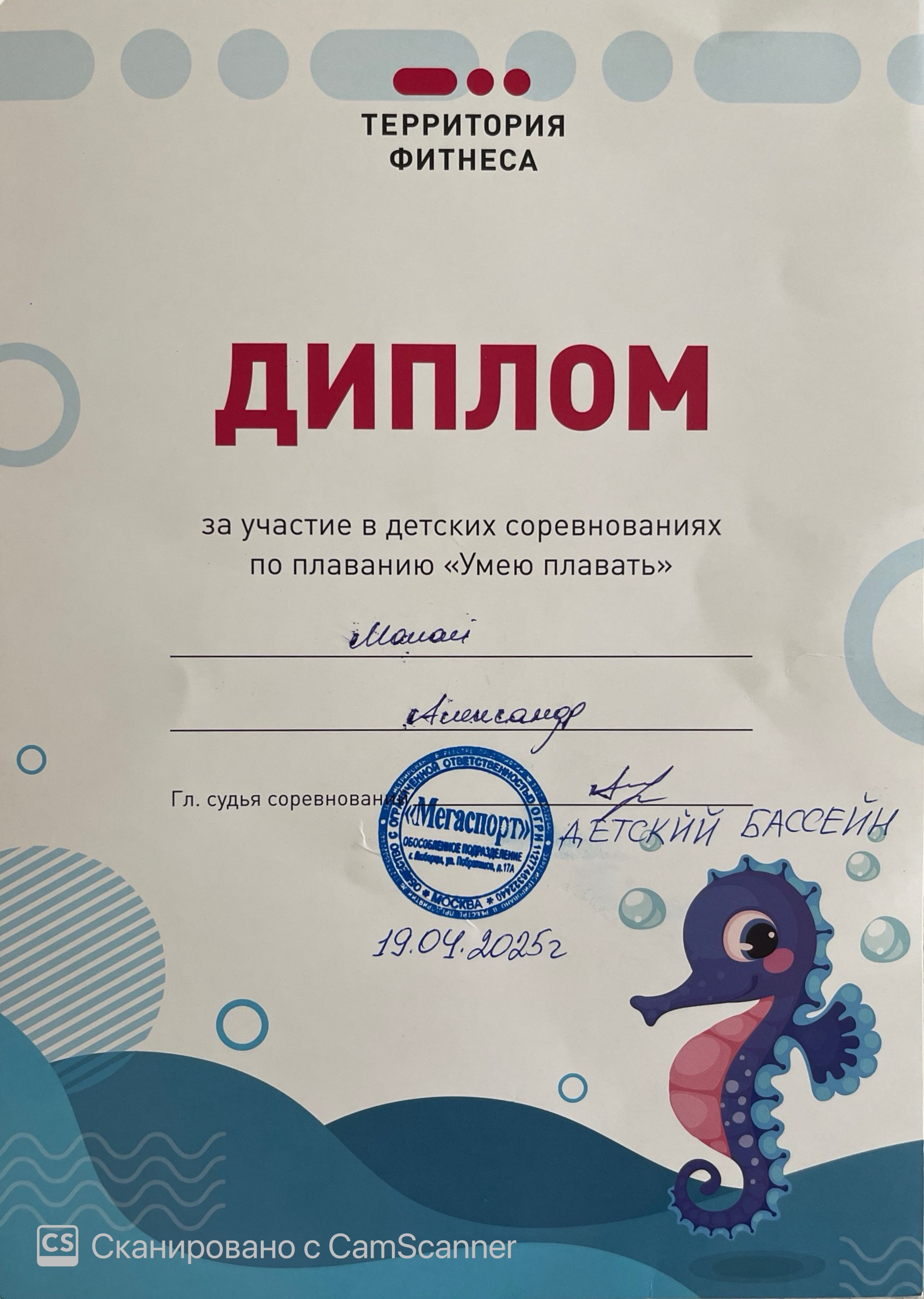 Диплом за участие в детских соревнованиях по плаванию "Умею плавать", Детский бассейн, ТЕРРИТОРИЯ ФИТНЕСА, 19.04.2025 г.