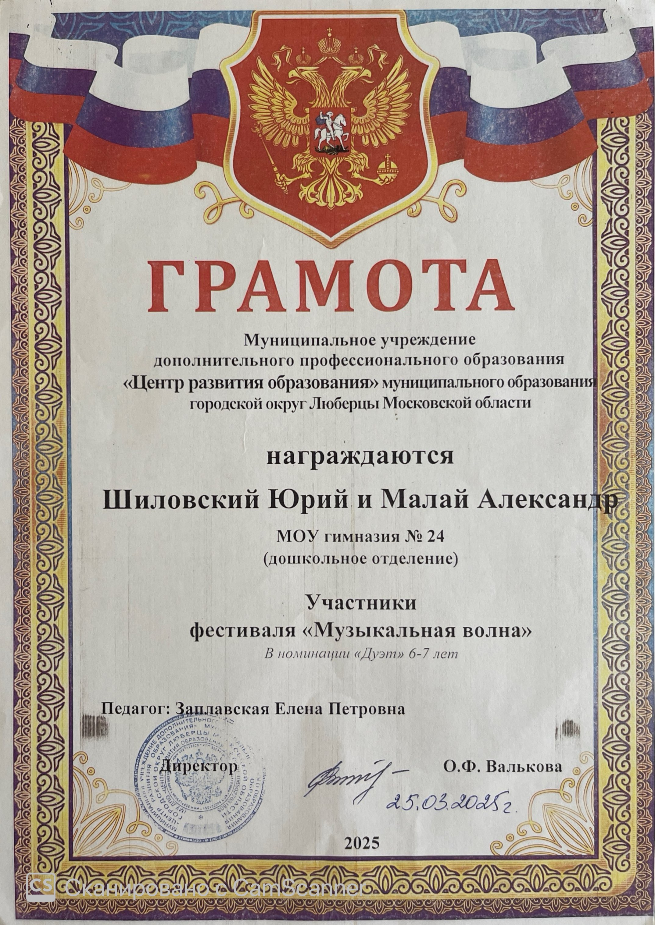 Грамота МОУ гимназия №24 (дошкольное отделение), участника фестиваля "Музыкальная волна" в номинации "Дуэт" 6-7 лет. Муниципальное учреждение дополнительного профессионального образования "Центр развития образования" муниципального образования , городской округ Люберцы Московской области, 25.03.2025 г.