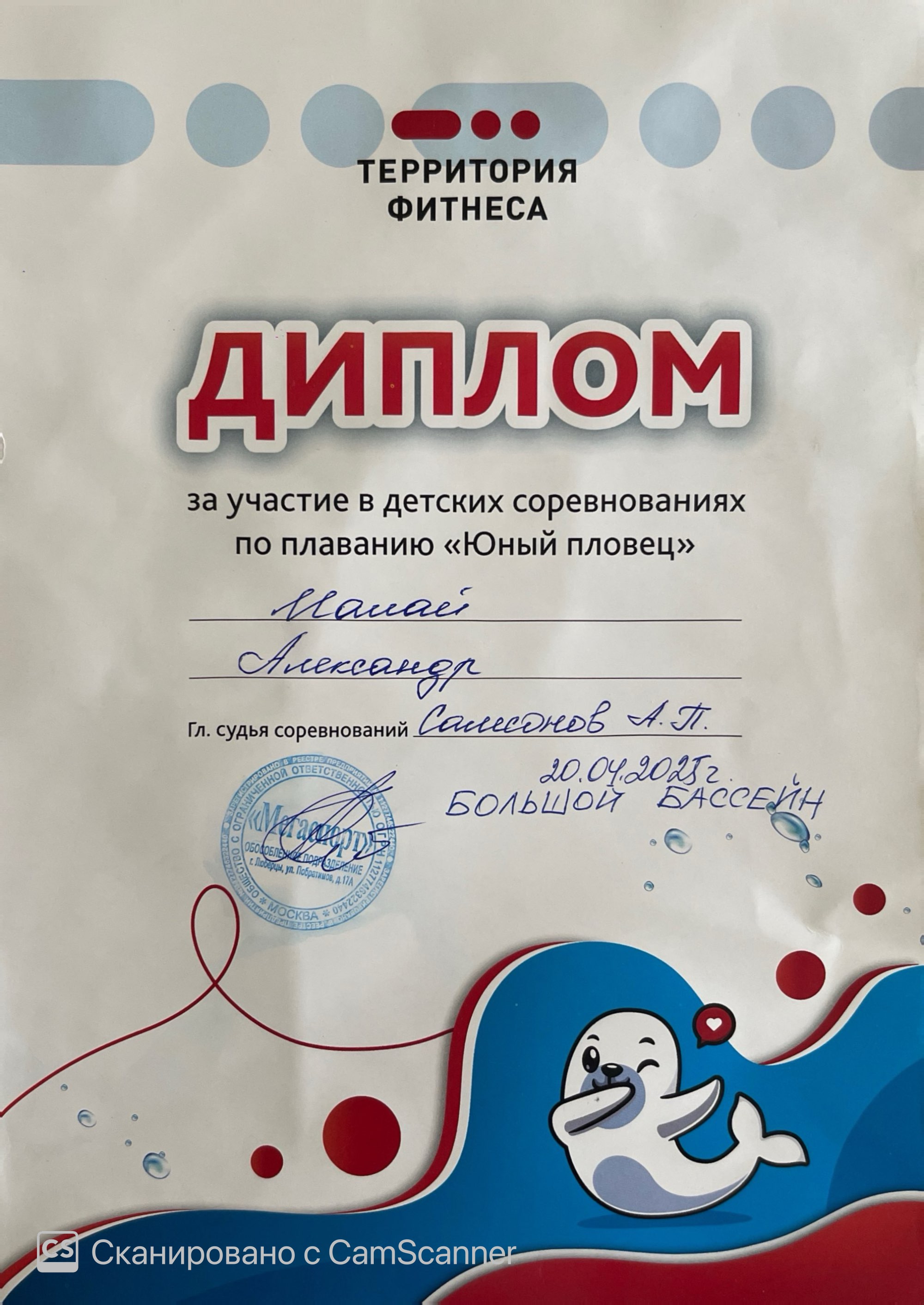 Диплом за участие в детских соревнованиях по плаванию "Юный пловец", Большой бассейн. ТЕРРИТОРИЯ ФИТНЕСА, 20.04.2025 Г.