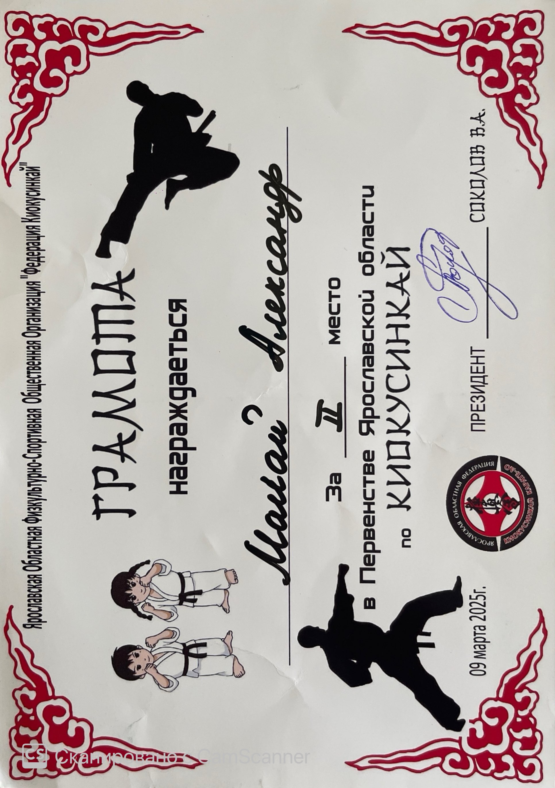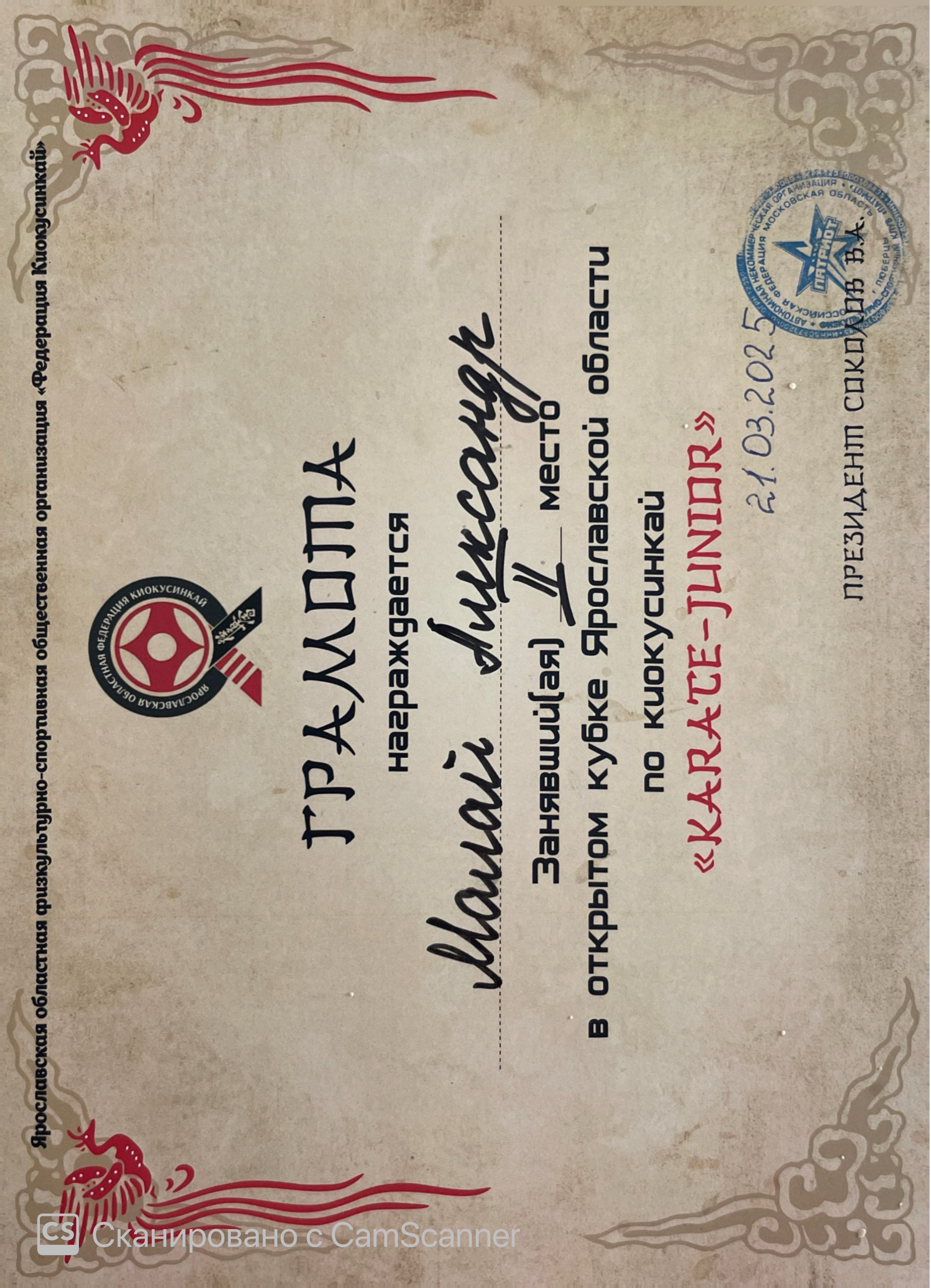 Грамота за 2 место в Открытом Кубке Ярославской области по киокусинкай "KARATE-JUNIOR". Ярославская областная физкультурно-спортивная общественная организация "Федерация Киокусинкай", 21.03.2025 г.
