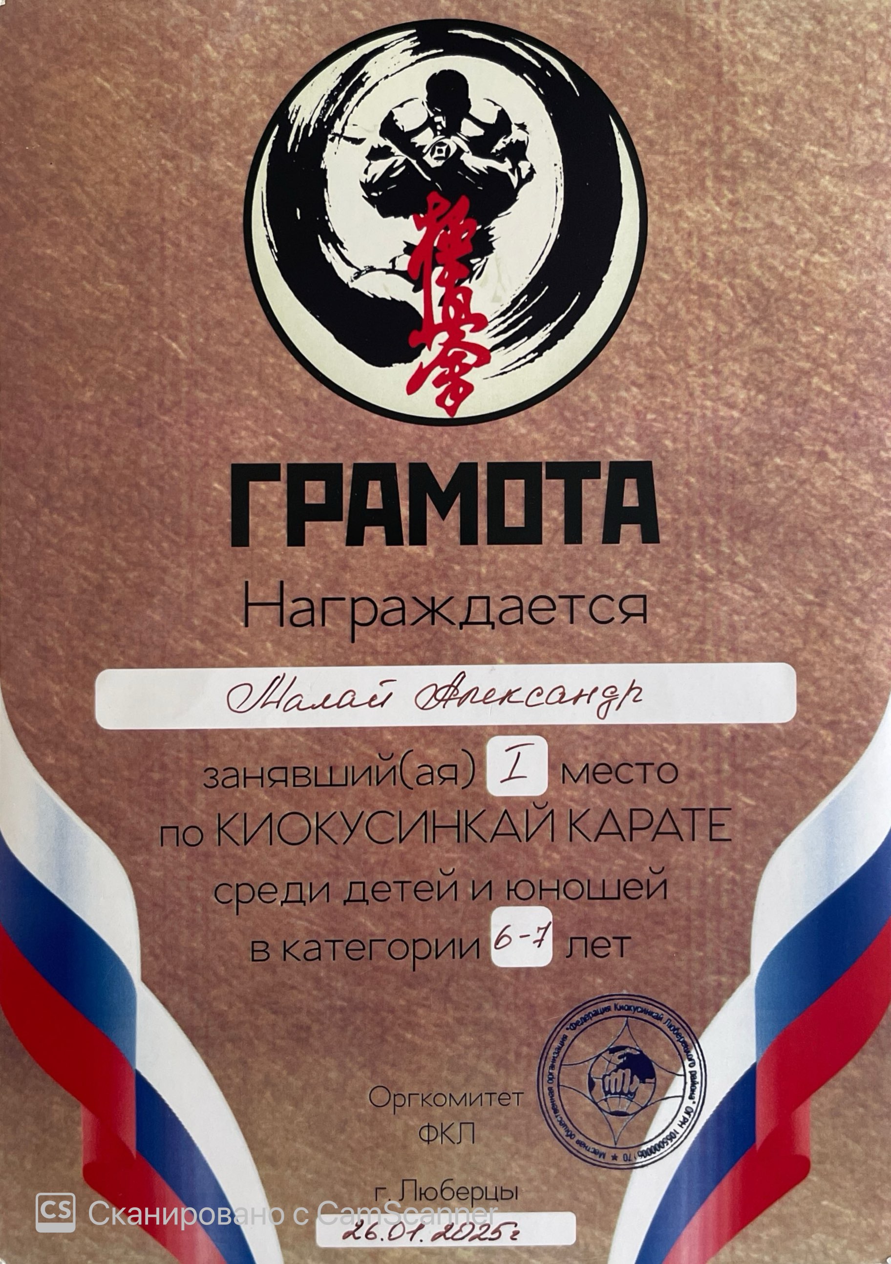 Грамота за 1 место по КИОКУСИНКАЙ КАРАТЕ среди детей и юношей в категории 6-7 лет. Оргкомитет ФКЛ, Федерация Киокусинкай Люберецкого района, г. Люберцы, 26.01.2025 г.