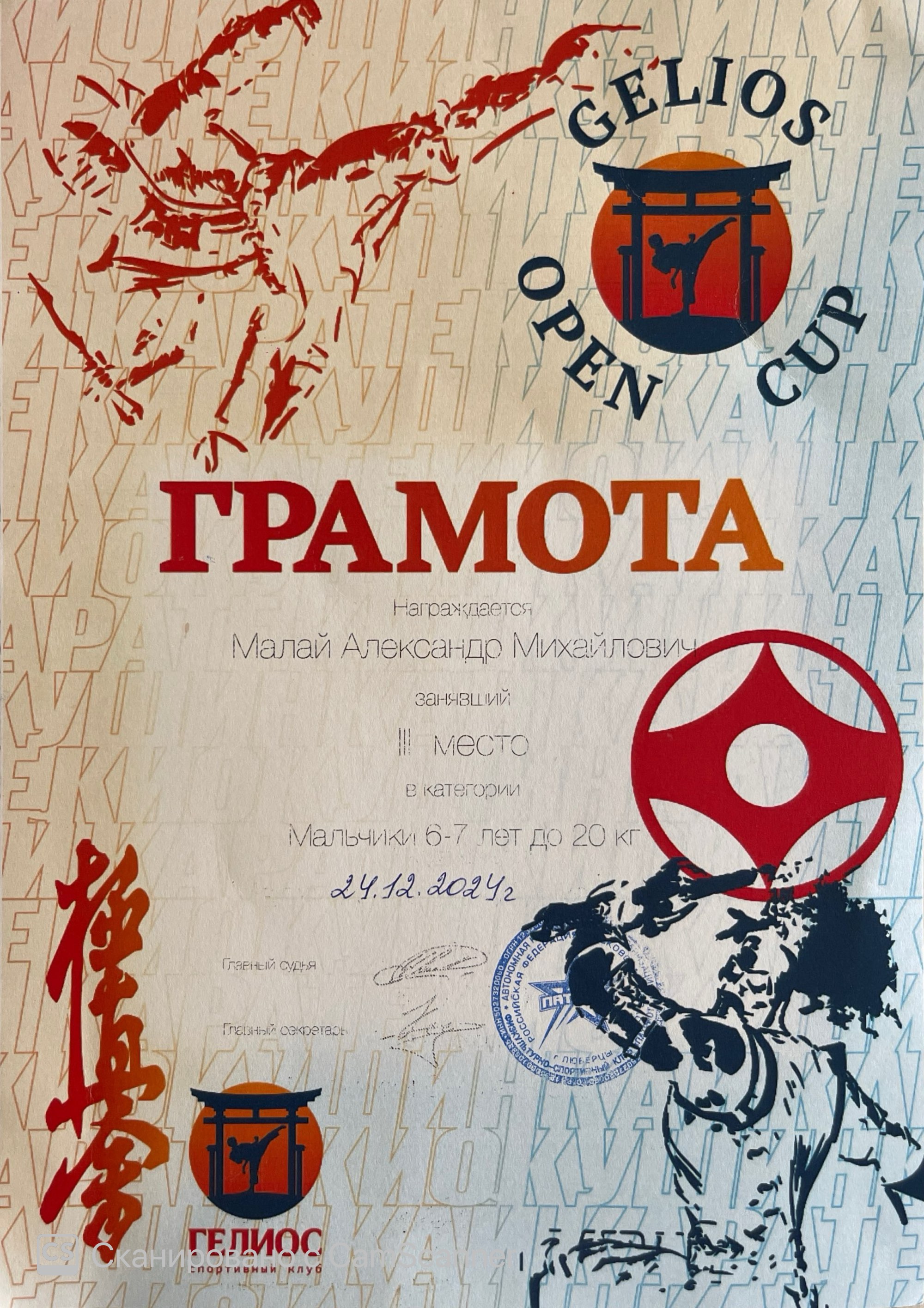Грамота за 3 место в категории мальчики 6-7 лет до 20 кг в соревнованиях GELIOS OPEN CUP, спортивный клуб "Гелиос", 24.12.2024