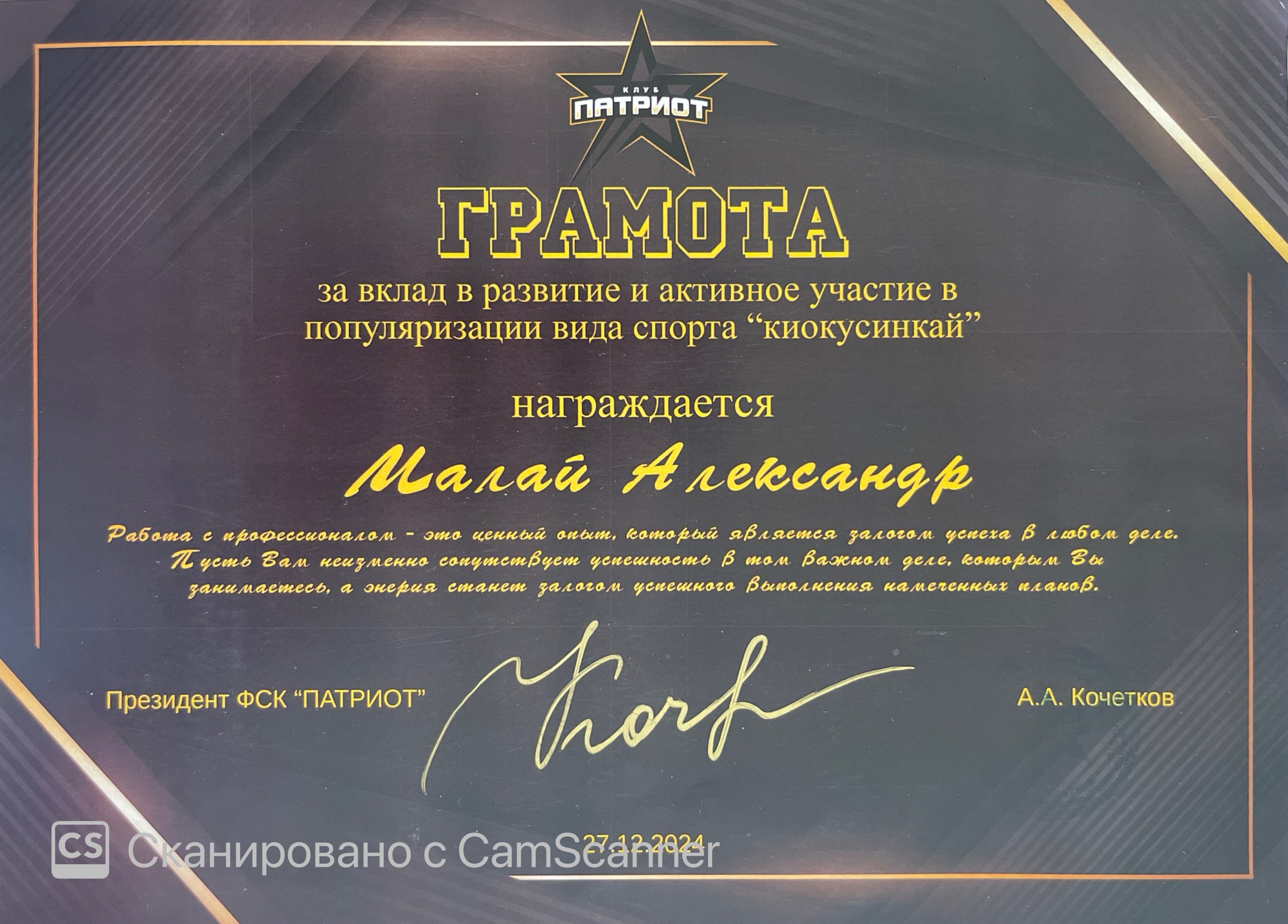 Грамота за вклад в развитии и активное участие в популяризации вида спорта "киокусинкай". ФСК "Патриот", 27.12.2024 г.