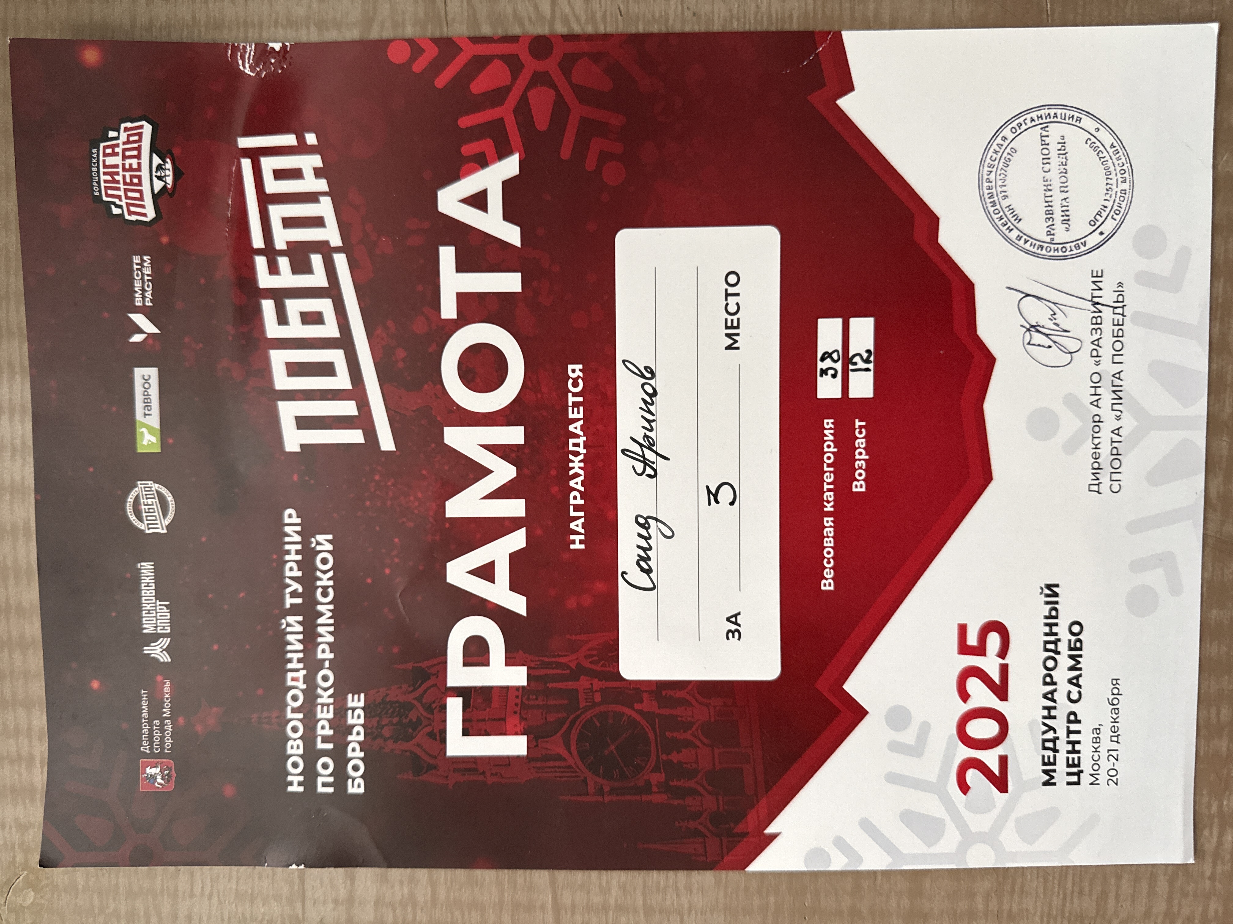 | Грамота Новогодний турнир по Греко-Римской борьбе, 3 место весовой категории 38 кг Москва 20-21 декабря 2025 года | Не обработано | ||